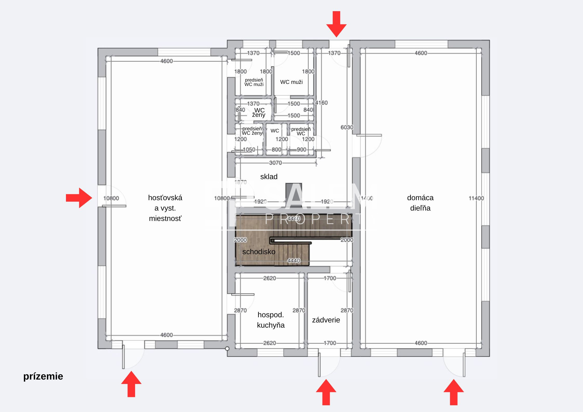 Dom má tri hlavné vchody z ulice, jeden bočný a jeden zadný vchod.